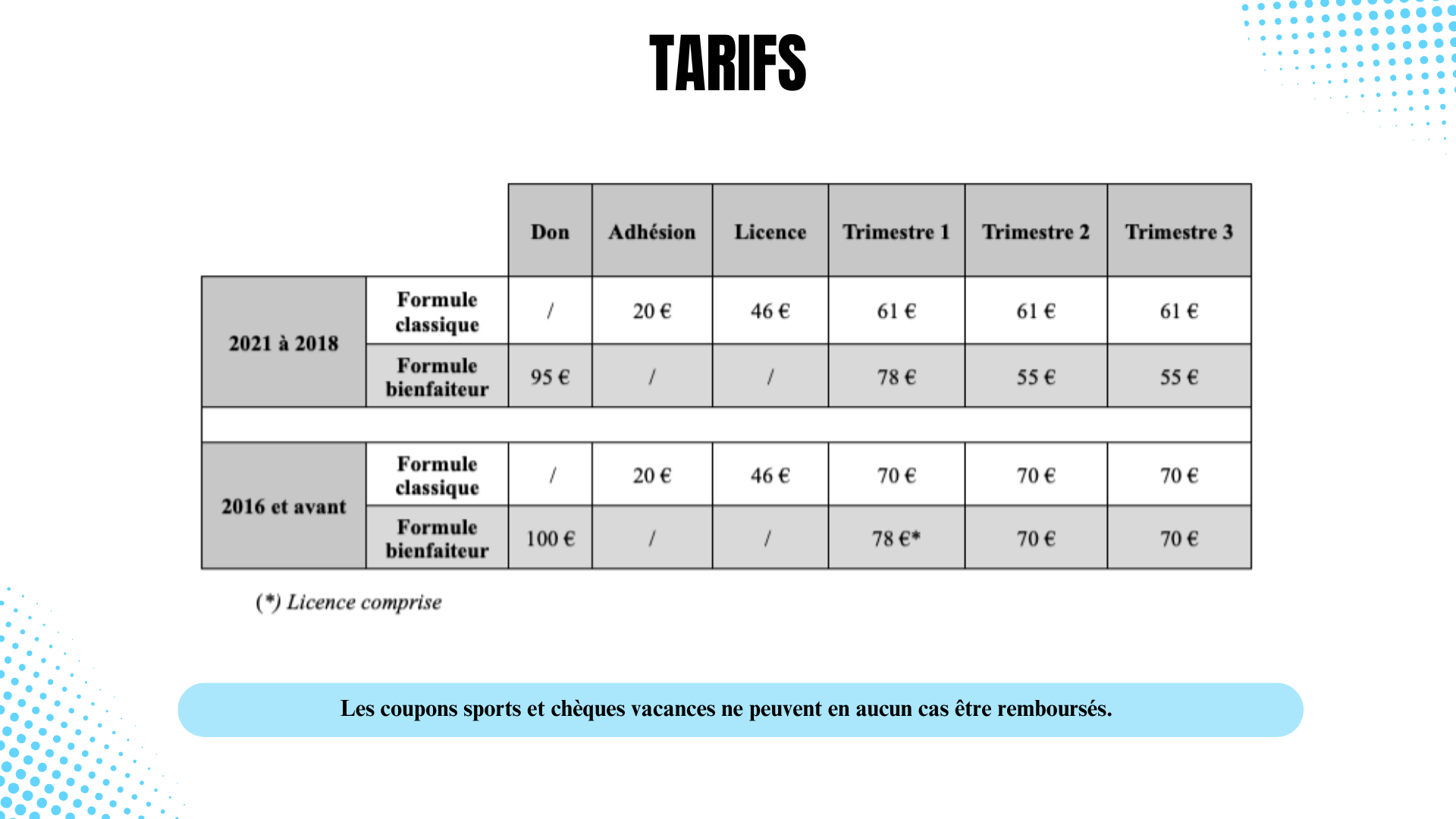 Formule bienfaiteur : vous permet de régler votre cotisation sous la forme d’un don au club, indépendamment de la quote-part cours et licence. Si vous choisissez cette formule, notre association vous fournira un cerfa (avant le 31 décembre 2025) vous permettant de déduire 66 % de la valeur du don de votre impôt sur le revenu. Le montant proposé dans le tableau est indicatif et minimum.